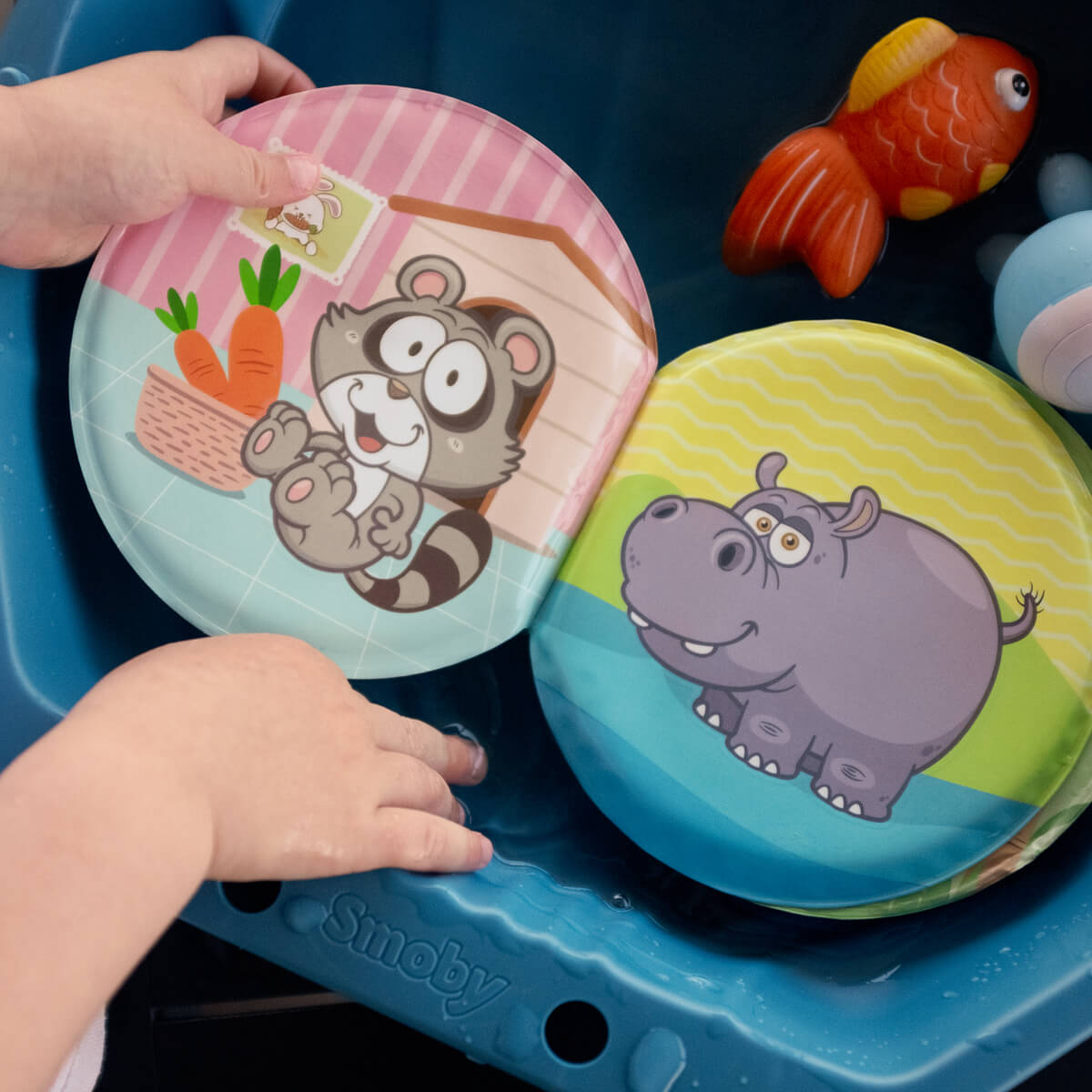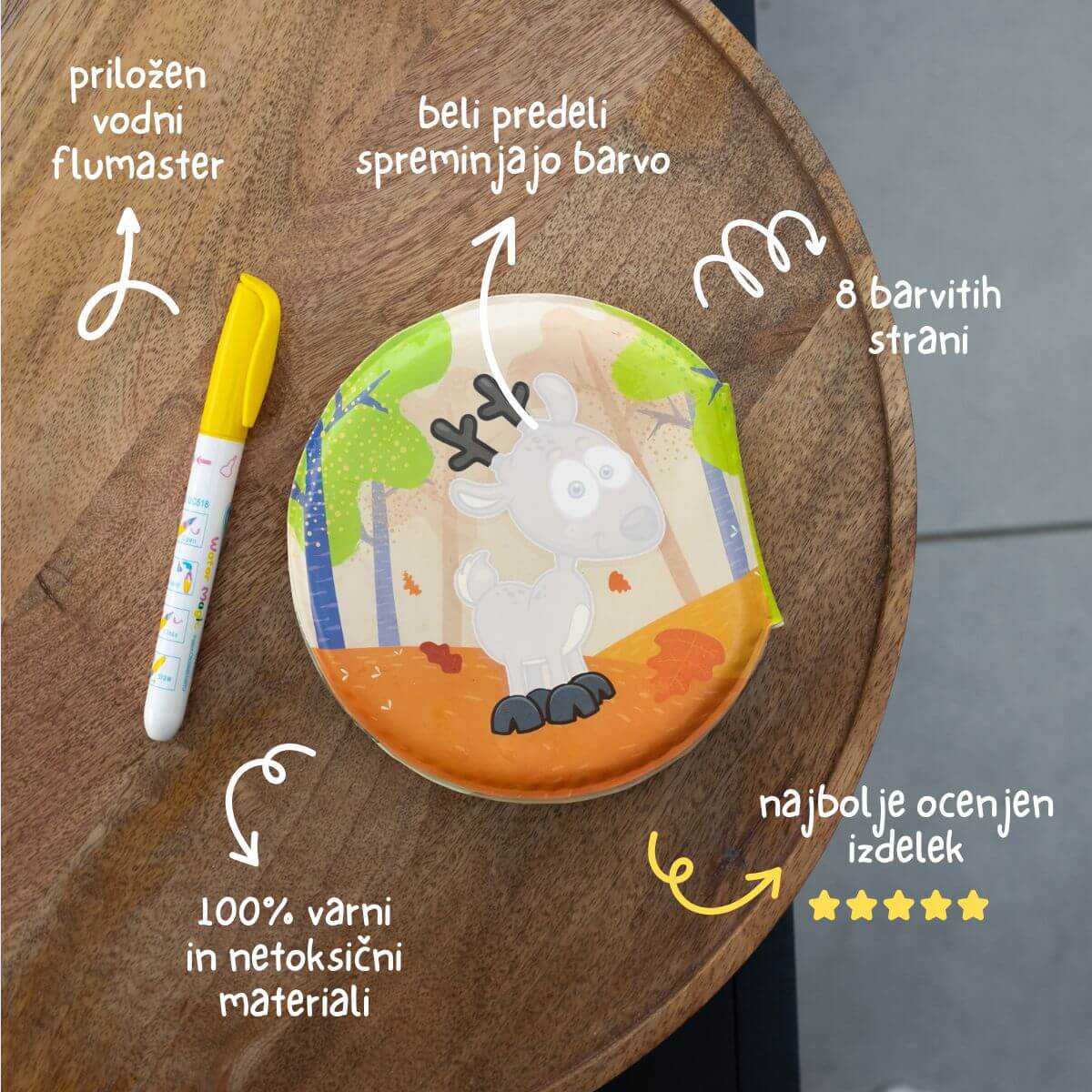 Iščete načine kako zamotiti in spodbuditi k ustvarjanju vašega malčka ure in ure, brez packanja, nereda in umazanije? Magično vodno knjigico pobarvate z vodnim svičnikom in prikažejo se čudovite barve morskih živalic. Po nekaj minutah se strani posušijo in lahko pobarvate znova in znova. Knigica je primerna tudi za večerno kopanje ali igro v bazenu. Za nešteteto pobarvanj. Varno za male rokice in radovedne ugrize.